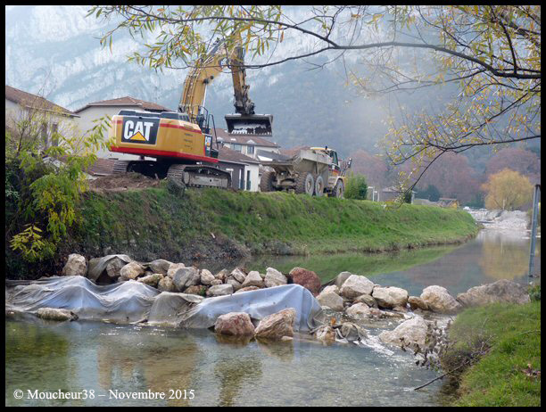 Les engins de part et d’autres du Furon œuvrent pour le renforcement des digues.