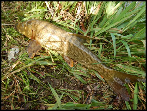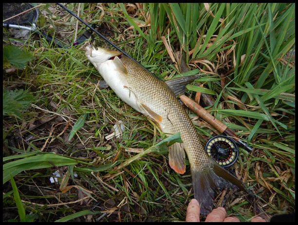 Après quelques passages infructueux, le pépère fait un écart et se saisi de ma nymphe qui roulait sur le fond, je ferre et la commence la lutte entre lui et moi, il joue de tout son poids pour ne pas se laisser prendre. Le bougre est malin, par deux fois il fait semblant de se laisser ramener sur le flanc et une fois l’épuisette à sa hauteur, redonne un coup de queue et repart au large, je ne sais pas combien de minutes sont passées , mais le combat s’éternisa, jusqu’à ce que je puisse enfin le prendre par dessous le ventre et le mettre sur la berge, l’épuisette paraissait petite à côté de ce magnifique lingot, au bas mot il devait atteindre 80 cm voir + à en voir la photo , en rentrant chez moi, j’ai mesuré la position du 1er anneau , il se trouve à 80 cm du talon  et à voir le barbeau allongé à côté de la canne , sa tête est proche du 1 er anneau , sa queue dépasse le talon, si il ne fait pas 80 cm ,il en est pas loin !!!