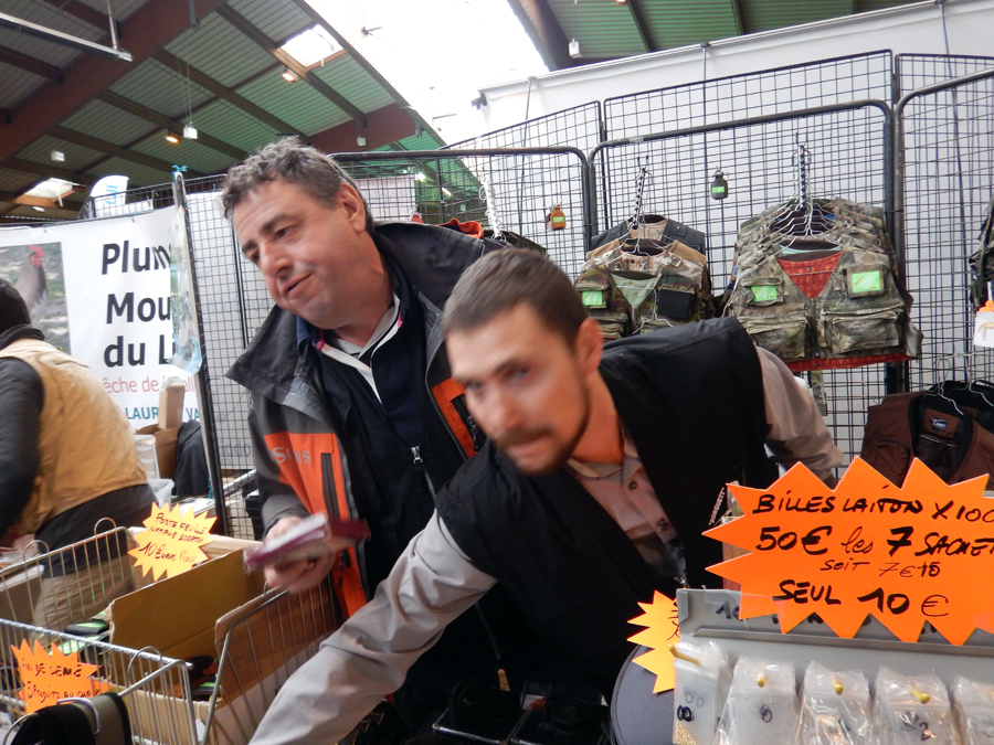 Claude et Jean, sont déjà en train de faire leurs achats sur le stand de Field and Fish, des chaussures de wading pour un et des waders et chaussures pour l’autre.
