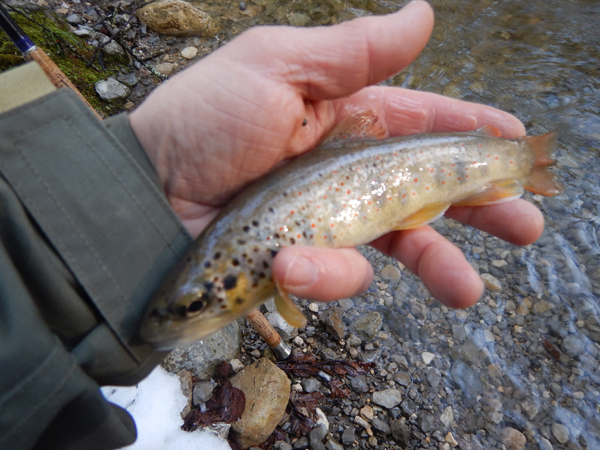 Comment résister face à un tel décor, Adrien qui n’a pu résisté à l’appel de l’eau , sort sa tocqueuse, choisit un petit ver et l’enfile sur l’hameçon, puis se dirige vers un spot que nous connaissons bien, après deux ou trois passages, il touche sa 1ère truite de la saison. Une jolie petite noireaude, certes pas un monstre, mais de quoi satisfaire un pêcheur qui ne sera pas capot.