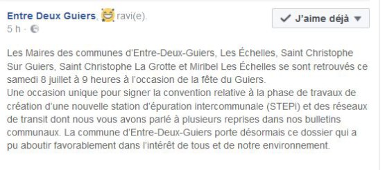 Publication mise en ligne sur la page Facebook de la commune d’Entre deux Guiers, commune ou se fera cette nouvelle station d’épuration d’un coût de 5 ME. Financé en partie par l’agence de l’eau et les communes.
