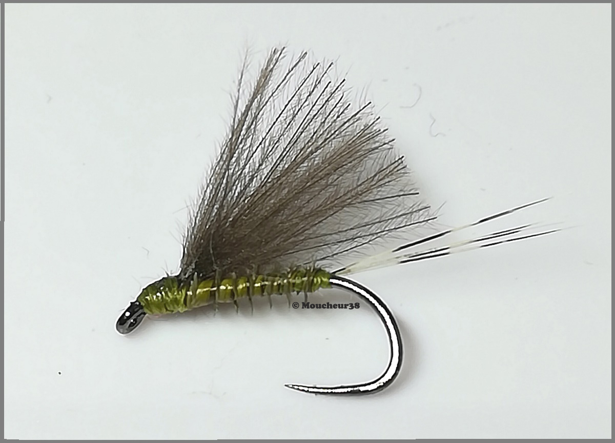 Matériaux : Hameçon : HDFLY 214 BL n°16 . Cerques : Coq pardo : Corps en quill de dinde olive : Aile en cdc gris : Le montage est réalisé avec du fil de montage 12/0 Veevus olive, la tête également.