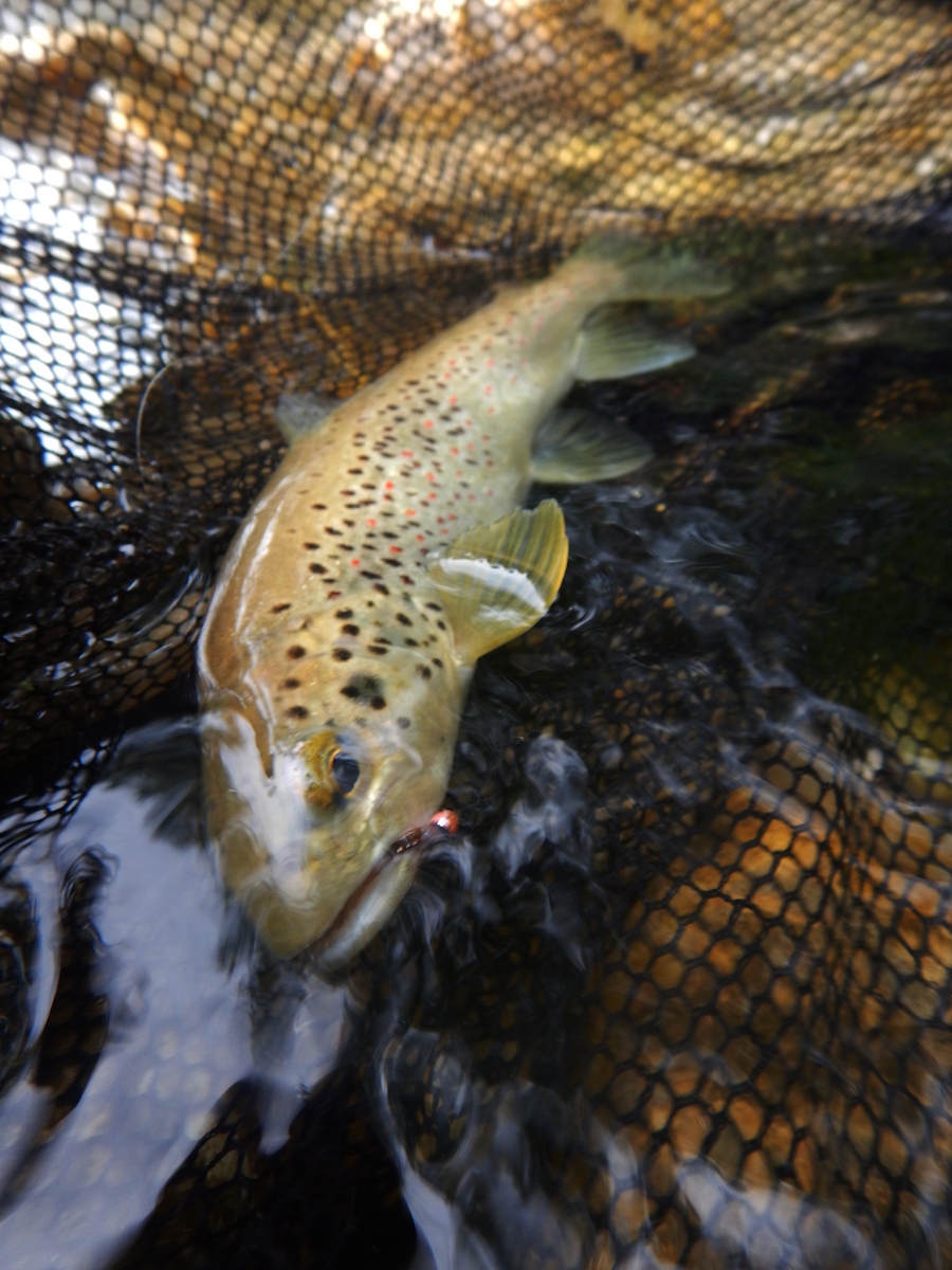 pour cette seconde sortie de la semaine,  je retrouve une rivière claire , mais avec un fort courant, quel plaisir d’évoluer dans une eau limpide, ça change des eaux blanches de la rivière précédente. Au final de cette session, 5 truites et un ombret. Une casse sur une très grosse truite estimé à 50, prise sur la nymphe en potence,  je l’ai tenu sur 30 mètres , lui ai fait traverser la rivière, du coup elle s’est calée sous une racine , j’arrive à l’a déloger, puis je lui fait remonter le cours d’eau le long de la berge afin de pouvoir la mettre au filet, mais le scénario ne s’est pas passé comme je le pensais et la belle m’est passée entre les jambes et en à profitèe pour casser à la potence et prendre la tengeante. Je ne vais pas bouder mon plaisir quand même, puisque je vais toucher d’autres truites dont une ou deux belles encore.