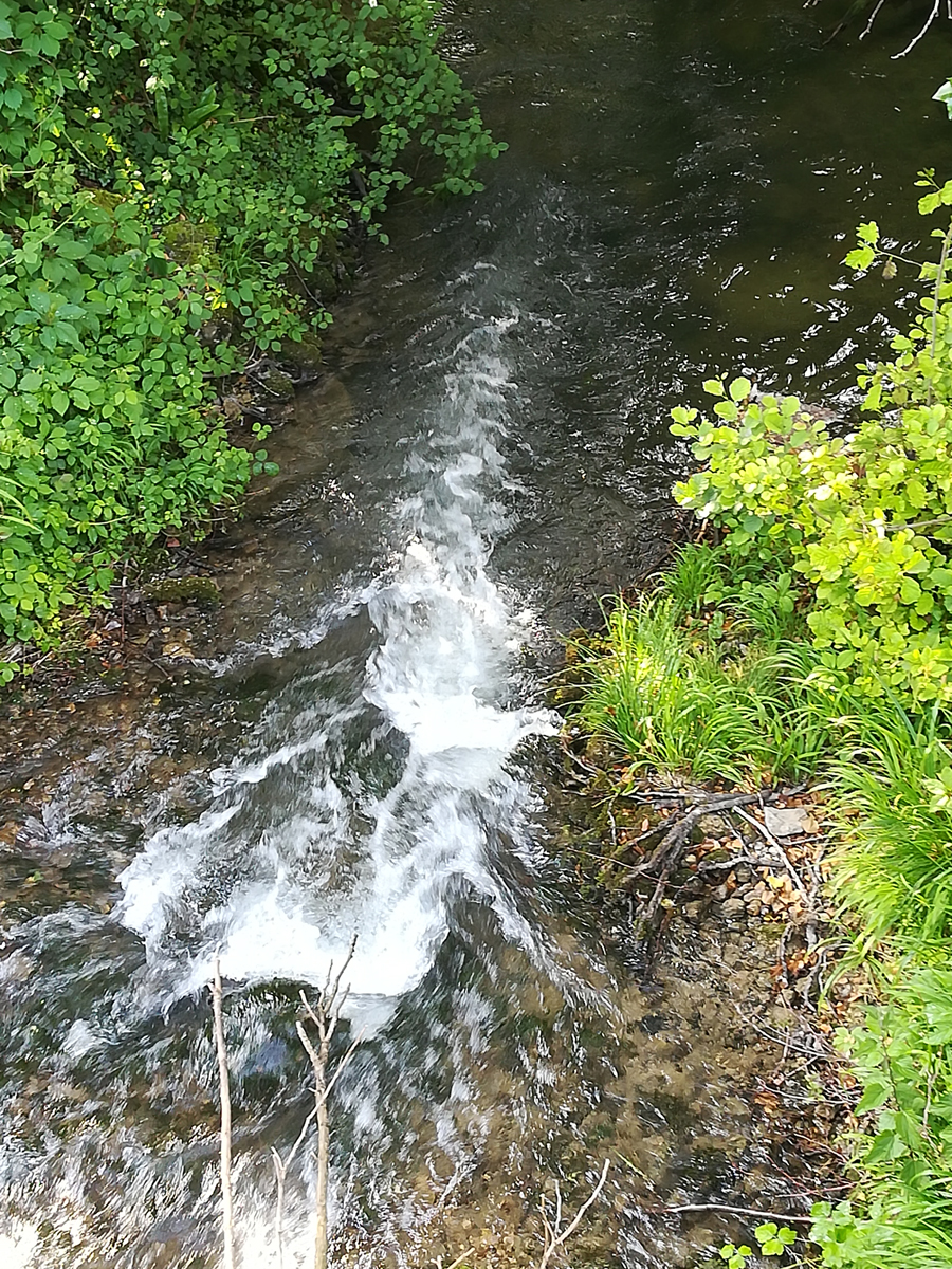 Je ne mets pas en doute la parole des instances concernées et habilitées pour la préservation et la protection des milieux aquatiques, ni celle de la société de pêche, mais je m’inquiète de l’état de santé de cette rivière. Après notre conversation, je suis allé voir sur le site de l’a appma concernée, laquelle relate cette pollution avec des photos de la résurgence ou il est dit que cela provient d’une résurgence des nappes et que c’est dû à un phénomène naturel, ce que nous savions déjà depuis mon alerte auprès de notre fédération de pêche et de la mairie. Seulement, je ne suis pas convaincu que ce soit vraiment dû à la cause d’un phénomène naturel et lundi dernier, le 28 mai, je me suis rendu sur place voire ce qu’il en était réellement. Je me suis dirigé au plus haut de la rivière et suite à ma prospection, j’ai pu constater qu’en amont du village, en direction des sources, la rivière à cet endroit était claire, voir photo ci-dessous, ce qui me laisse penser, que la provenance de ces eaux blanches, doit se faire aux environs du village.