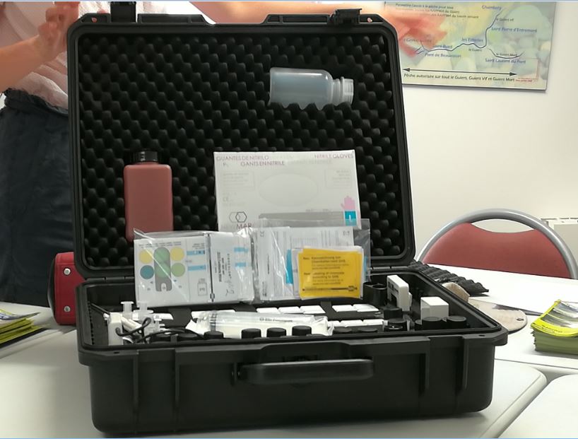 C’est donc, ce samedi 30 Juin 2018, que nous nous sommes tous retrouvés au siège de la réciprocité Guiers situé à la maison de l’Octroi aux Échelles(73), où nous avions rendez vous avec nos formateurs Mr Haettel Bruno responsable cellule eau et de Melle Léa Delcure sa collaboratrice, de l’antenne SAMU Environnement Bourgogne Franche Comté, venus bénévolement de Franche Comté passer une journée complète avec nous , afin de nous former à l’utilisation de cette mallette SAMU environnement, équipée de divers produits d’analyses, thermomètre, gants , flacons, etc. Lors de cette journée de forte canicule, nous n’étions pas devant notre télé pour regarder le match de coupe du monde France / Argentine, encore moins pour pêcher. Par contre, nous étions au bord de l’eau pour effectuer des prélèvements sur les points noirs qui touchent notre rivière le Guiers et autant dire que nous avions déjà notre idée où effectuer ces prélèvements d’eau à la recherche de Nitrites, Ammonium etc, voir la liste ci-dessous.