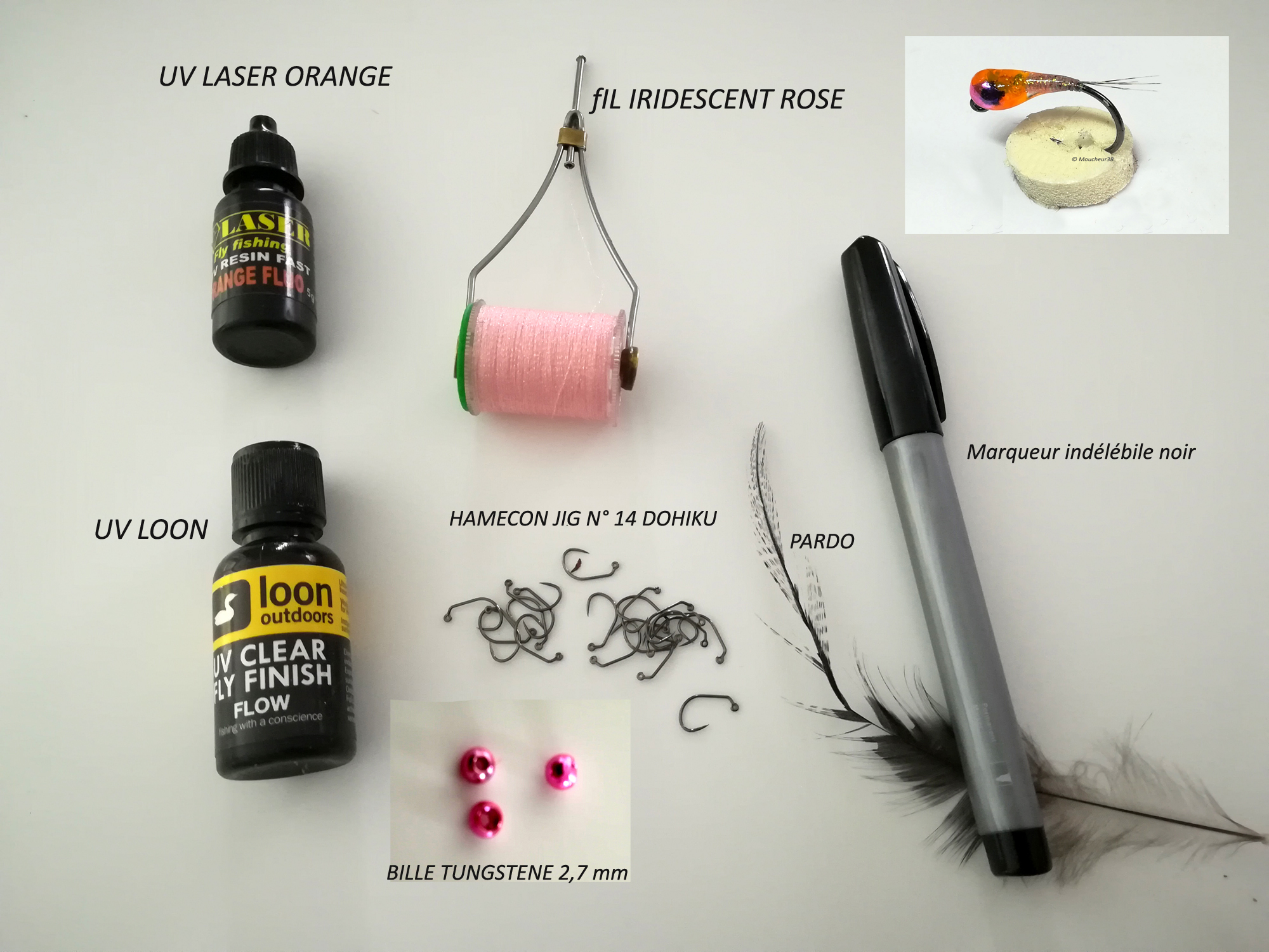 Matériaux : Bille tungstène 2,7 mm rose métal Hameçon JIG n°14 Dohiku Cerques : pardo Corps : fil iridescent rose Yeux : marqueur noir indélébile Vernis laser UV orange sur le dessus et le dessous de la bille. Vernis UV Loon pour la finition du corps