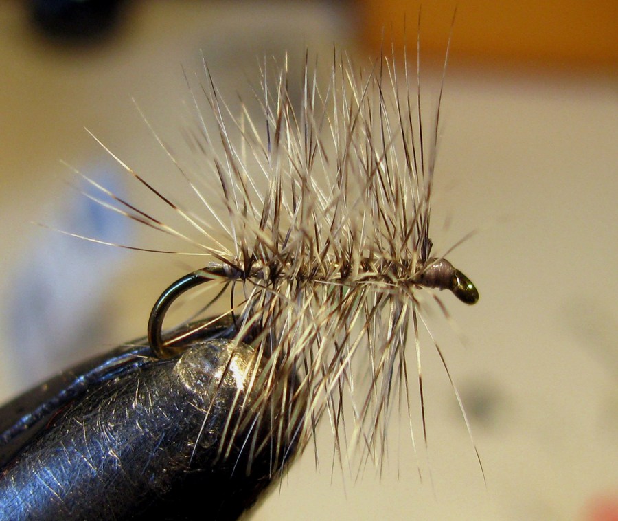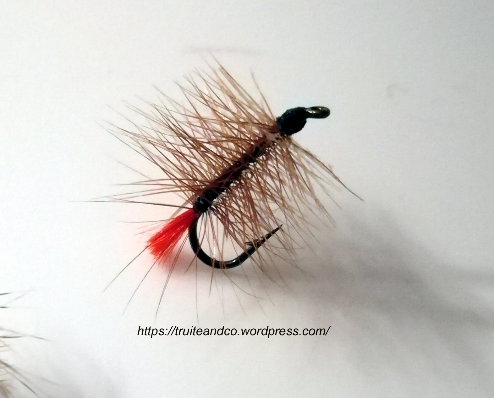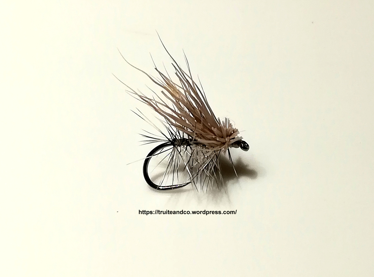 Agrémenté d’un tag fixé à l’arrière et d’une pincée de poils de cervidés pour les ailes, l’Elk hair , c’est son nom, aura une flottaison et une visibilité parfaite pour pêcher les courants, je m’en sers pour imiter un petit Sedge entre autres.
