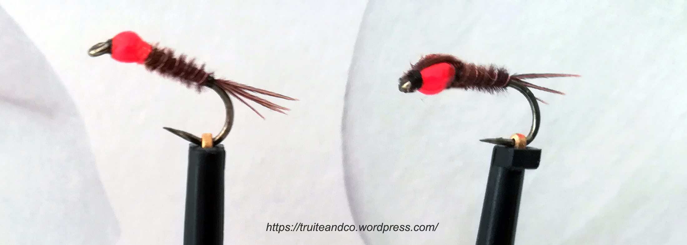 Je me suis vite rendu compte que, plutôt que de faire le thorax avec de la soie floss orange fluo et le vernir par la suite. On obtient un gain de temps en posant directement cette résine UV , à l’aide de la pointe d’une aiguille à dubbing, sur le fil de plomb ou de cuivre.