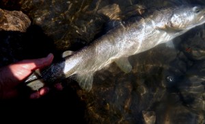 Le combat s’engage, c’est du lourd, je sens les coups de tête, elle fait un premier rush, je la bride. Zut, la voilà, qu’elle se cale sous un gros bloc, mais je réussis à l’a déloger, elle reprend le large. Ma ligne est tendue à son maximum et la canne arc-boutée, le frein est réglé, mais par manque de chance, la soie vient se bloquer entre le bâti et la bobine, j’ai bien peur de ne pas conclure. C’est à la main, que je ramène ma soie, j’en chie, cette truite est lourde, mais au bout d’un moment, enfin je réussis à la mettre dans l’épuisette.