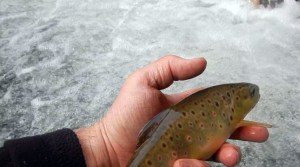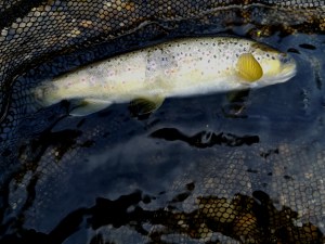 Je suis aux premières loges, juste en dessous du seuil, ce n’est pas une truite qui gobe, mais deux, trois, quatre, les éclosions se multiplient. Je choisis une truite, celle de gauche, c’est la 1ère qui était active, elle se trouve sous la pile du pont, je lance sa mouche dans son champ de vision, je vois la truite qui monte vers la mouche, un remous, je lève la canne , elle est ferrée et aussitôt ramenée dans le filet.