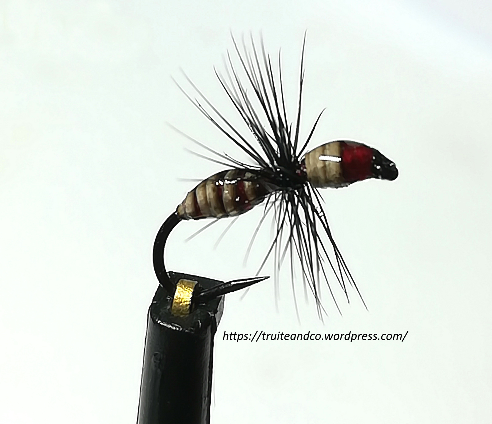 le 1er montage est réalisé tout en quill de paon ébarbé pour le corps et le thorax . Un petit détail qui a son importance, pensez à bien graisser cette mouche, sinon elle coulera assez vite, c’est le seul point négatif de cette mouche.