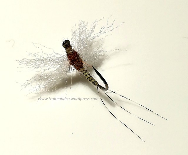 Hameçon : Courbe n°16/18 – Cerques : pardo – Abdomen : Fil de montage olive – Cerclage : fil de montage teint au marqueur noir sur 2 à 3 cm – Thorax : dubbing super fin de lièvre, couleur marron clair – Ailes : para-fibre blanche – Tête : fil de montage teint en noir.