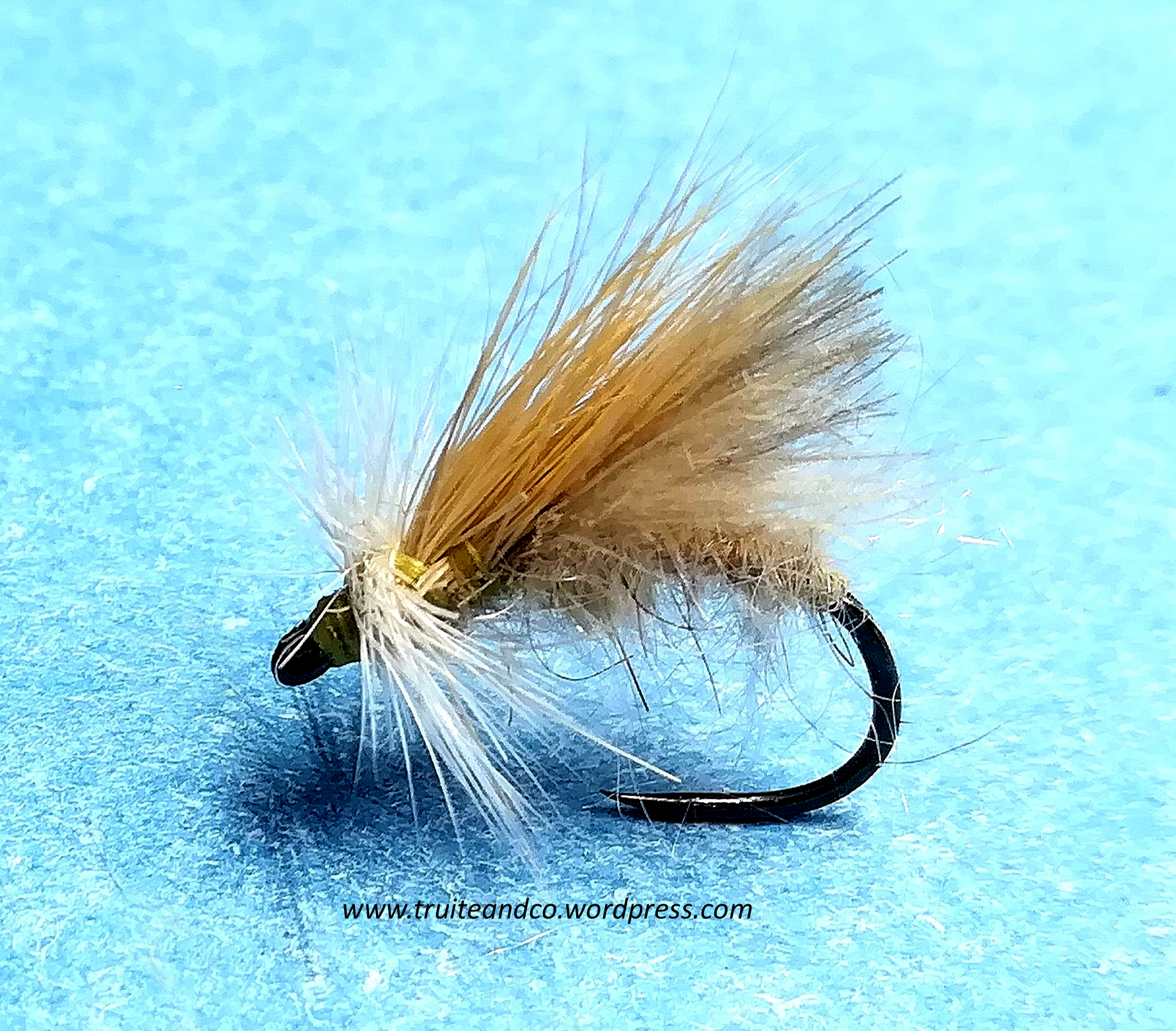Matériaux nécessaires : Hameçon : Courbe 252 BL n°12/14 – Abdomen : dubbing Hare Earl plus beige – Thorax : dubbing de Hare Earl plus ou de lièvre couleur beige – Ailes : un toupet de cdc beige et une pincée de poils de cervidé de couleur claire (crème) – Collerette : hackle ou lancette de couleur crème – Tête : fil de montage 12/0 Veevus jaune paille.