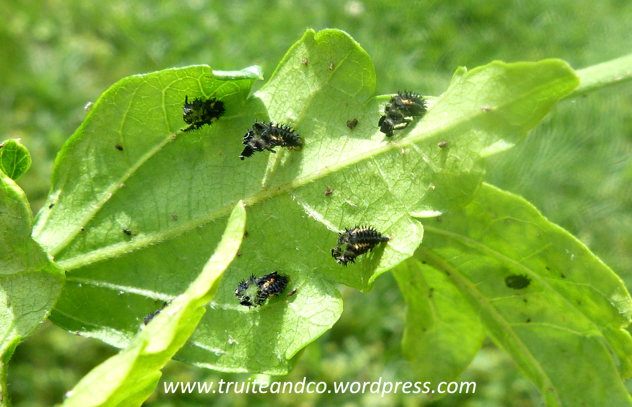 Sur un autre de mes arbustes, un hibiscus, j’ai donc réalisé la même opération, en déplaçant ces dernières sur deux autres arbustes. Les larves de coccinelles qui squattent mes arbustes, en quête de nourriture, pourront se gaver de pucerons, sachant que celles-ci consomment plus de 50 pucerons par jour, le calcul est vite faite, 10 larves sont égales à 500 pucerons en moins, alors s’il y en a davantage, c’est encore plus intéressant.