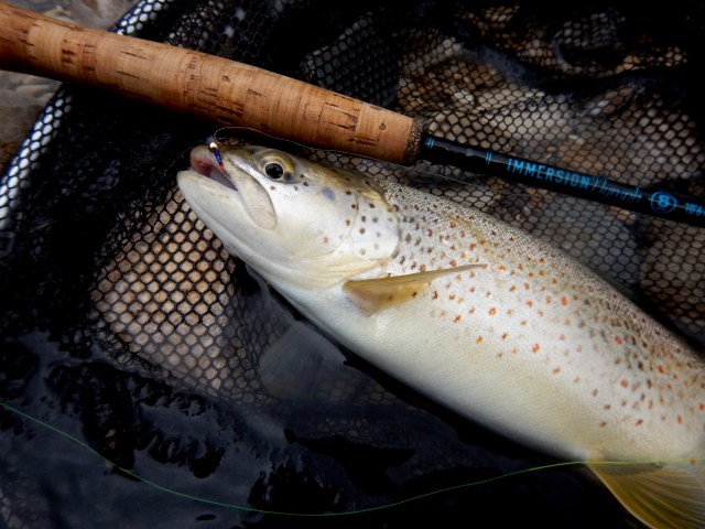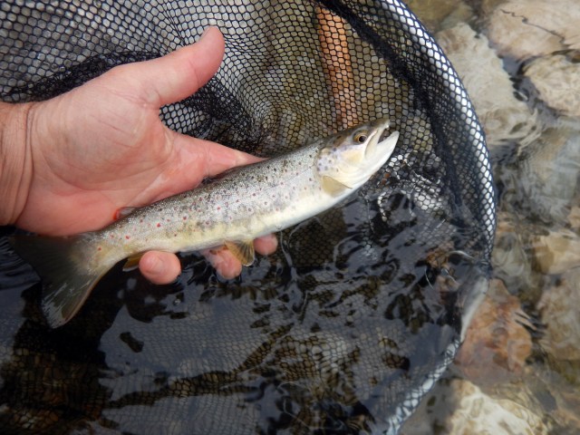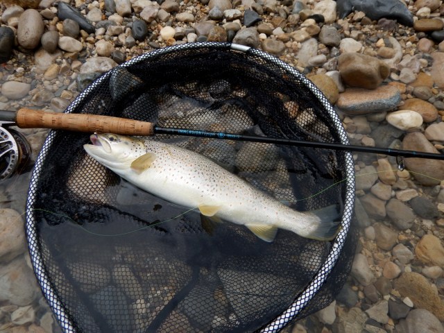Sur le 1er spot, je vais toucher une jolie truite en nymphe, mais je me fais avoir par un démarrage furtif, j’ai beau essayer de l’a brider, elle cherche à se caler sous un bloc et après quelques secondes, elle finit par se dépiquer.