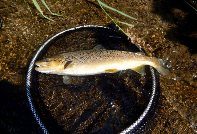 Pour tout dire, elle ne m’a pas déçu, elle a fait le job, en me faisant prendre la plus grosse truite de l’après-midi, cette truite fait environ 45 cm, si je m’en réfère à la graduation qui se trouve sur ma canne …