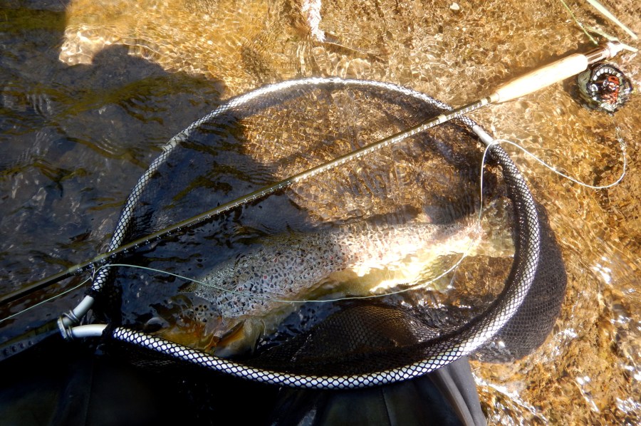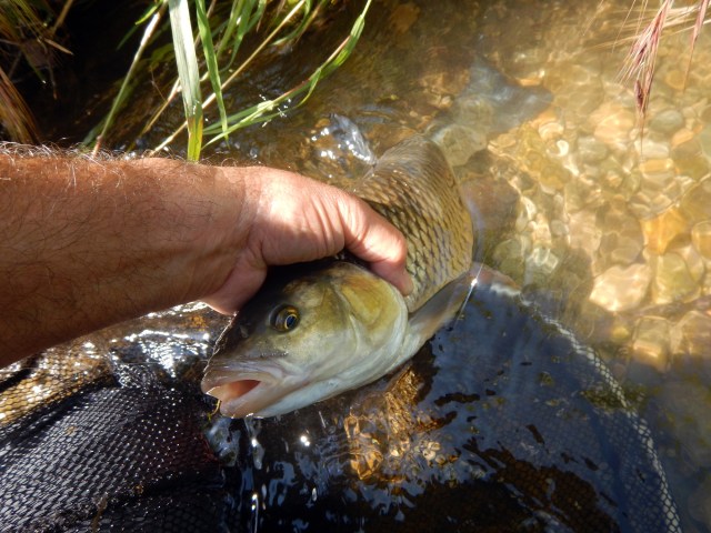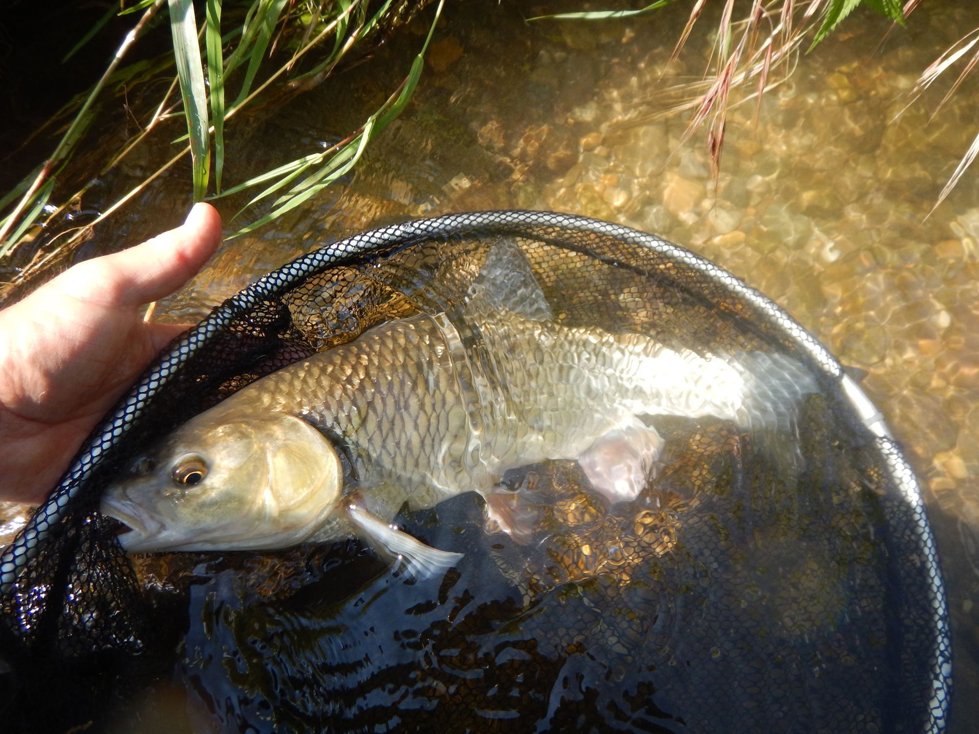 Je m’approche du spot, j’aperçois quelques gros cheucheux, j’en sélectionne un, il est bien gros. Je vais faire tomber ma nymphe dans son champ de vision, celle-ci tombe dans l’eau et là, je vois ce gros cheucheux se ruer sur la nymphe gueule ouverte pour l’engloutir, je ferre, il est pris !.. Ce genre de gros poisson est très combatif quand il a atteint cette taille, voire même plus gros encore et après quelques jolis rushs, je réussi à lui mettre la tête hors de l’eau, puis le laisse glisser jusqu’à l’épuisette.