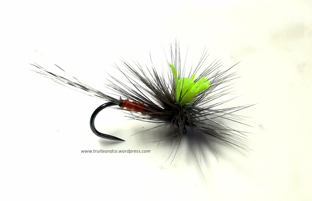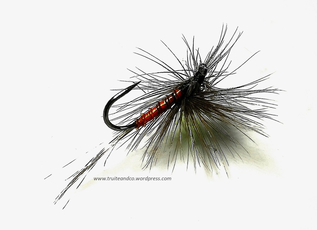 Hameçon: droit n°14/16 – Cerques: coq pardo – Corps: substitut orange – Toupet parachute: floss jaune ou orange fluo – Aile: lancette grise de chez Hoffman Fil de montage Veevus 12/0.