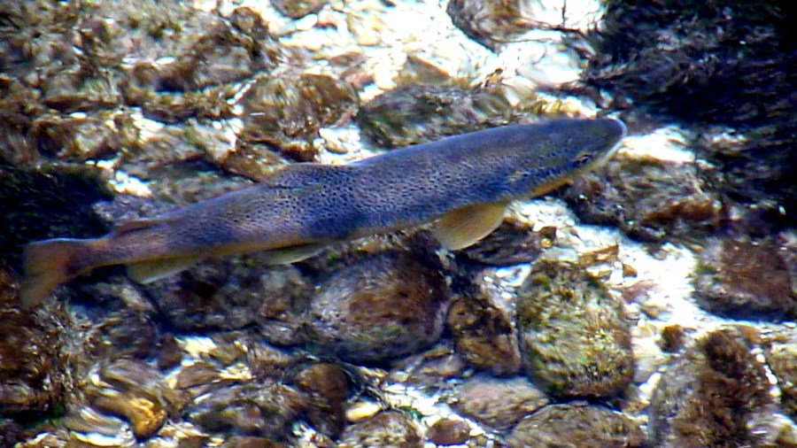 Plus amont, une truite morte gît sur les galets, il n’est pas rare, de voir des truites qui meurent au cours du frai, une mort causée par les efforts dus aux kilomètres parcourus pour remonter sur les parties les plus hautes du cours d’eau, mais également à la préparation du nid et de la ponte, j’ai même déjà vu plus d’une truite morte les autres années.
