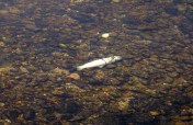 Plus amont, une truite morte gît sur les galets, il n’est pas rare, de voir des truites qui meurent au cours du frai, une mort causée par les efforts dus aux kilomètres parcourus pour remonter sur les parties les plus hautes du cours d’eau, mais également à la préparation du nid et de la ponte, j’ai même déjà vu plus d’une truite morte les autres années.