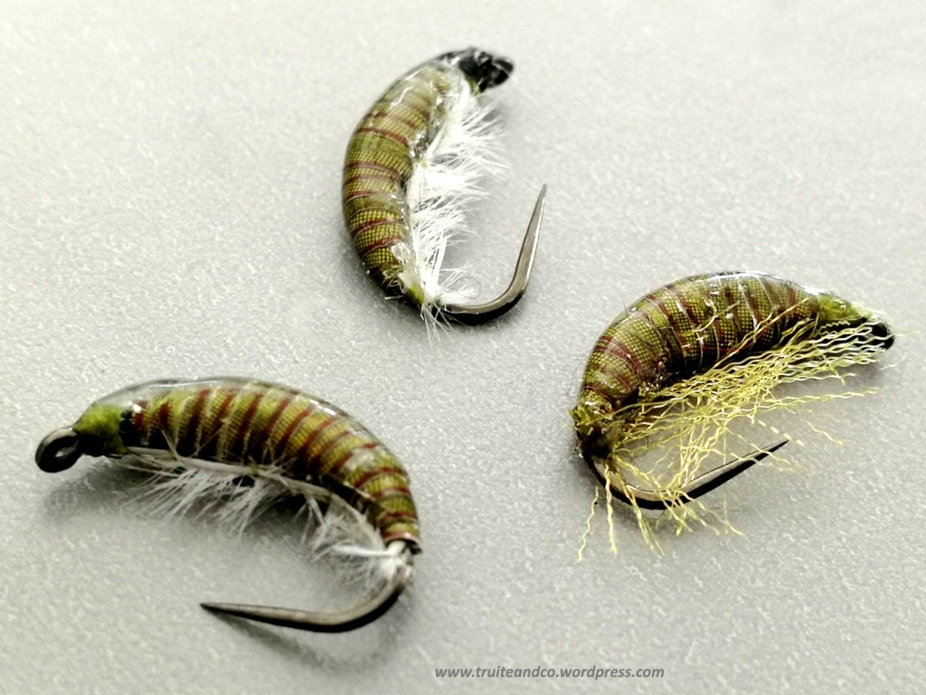 Matériaux utilisés : Hameçon : Caddis n° 14 -12 – Lestage : fil de plomb 0,30 – Corps soie floss et fil de montage – Carapace quill synthétique Hemingway – Pattes : herls de plume d’autruche (blanche) ou de l’organza olive – Fil de montage : olive 12/0 – Vernis Uv.