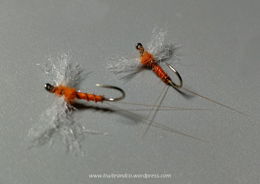 Matériaux utilisés : Hameçon : Sempé DFH 24 BL n°14 et 16 – Cerques : 2 spinners tails – Abdomen : herl substitut de condor orange – Thorax : dubbing super fin orange – Ailes : parapost blanc – Fil de montage : Veevus rusty