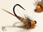 Hameçon : Gamakatsu JIG NYMPH #14 –  Tête : Bille tungstène chocolat 3,2 mm – Cerques : une pincée de hackle roux  –  Corps : soie floss crème – Cerclage : fil de montage 8/0 marron et fil de cuivre blanc – Thorax : dubbing de lièvre et écureuil mélangé ( fabrication maison). Résine UV pour le corps.
