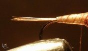 7- Préparez une boucle à dubbing et insérer le mélange de poils de lièvre et d’écureuil, twister le tout et former le thorax par quelques enroulements (2 ou 3) suffisent.