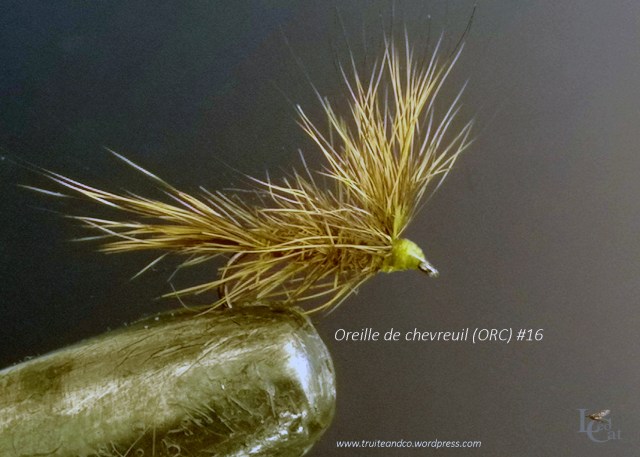 ce modèle émergent (orc) , est réalisé qu’avec des poils provenant d’une oreille de chevreuil, prélevés sur l’extérieur ou à l’intérieur, l’avantage de ces poils, c’est qu’ils plus souples et soyeux et ont une très bonne flottaison.