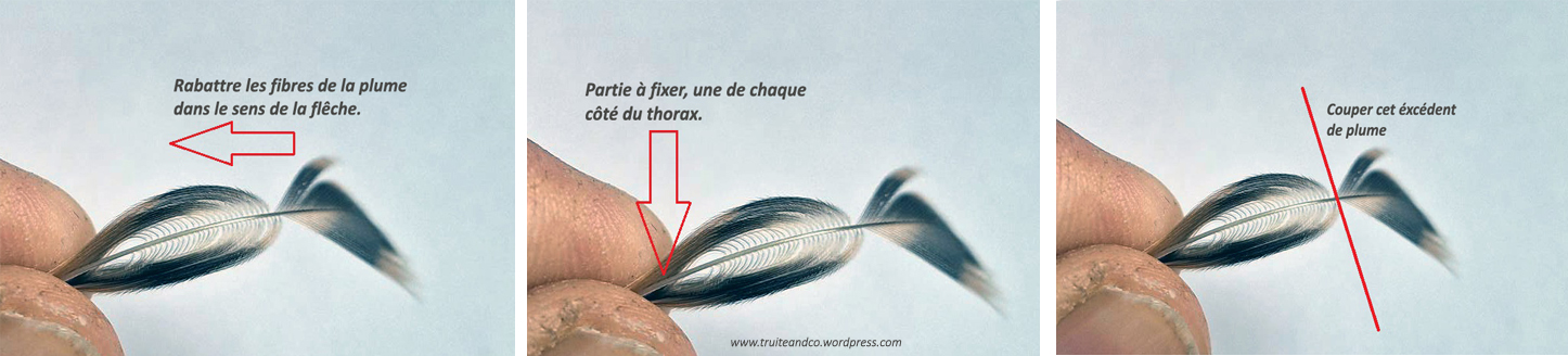 4. Les fixer de chaque côtés du thorax, ainsi qu’une pincée de sabres de faisan, qui restera sur la partie inférieure du thorax (dessous).