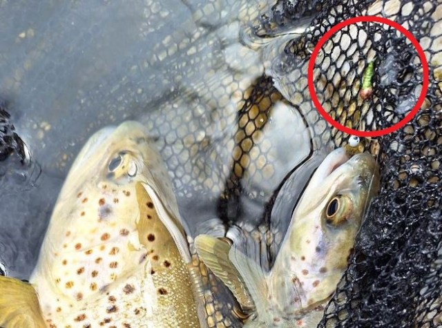 Je vais suivre le conseil et choisir la couleur chartreuse ! pour sourire un peu j’avais repéré cette photo du doublé des 2 truites sur un précédent article publié ! j’avoue avoir essayé de trouver cette couleur par mes propres moyens, me voilà comblé !