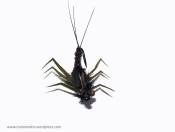 Hameçon : Courbe n°12 – Cerques / Abdomen /Sac alaire : Sabres prélevés sur une queue de faisan – Cerclage : fil de cuivre ou fil de montage – Pattes : 6 Biots d’oie olive – Thorax : dubbing de lièvre noir – Yeux : fil nylon de 35 centièmes brulés aux extrémités avec un briquet – Fil de montage : Veevus 12/0 noir .
