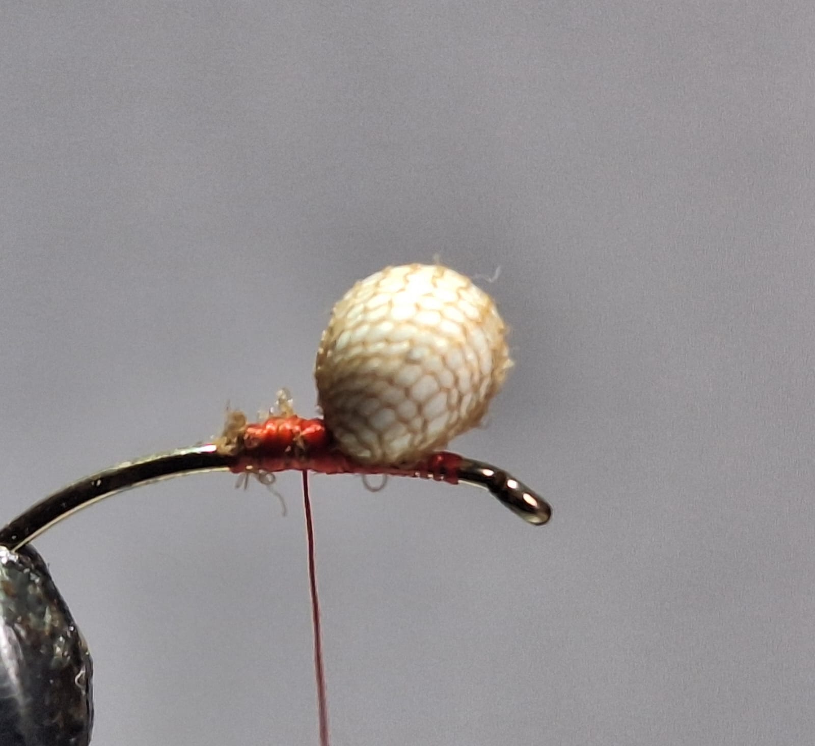 4) – Ensuite, prendre une petite bille de polystyrène , le mettre dans d’un bas nylon très fin (couleur chair ou blanche) peu importe, puis fixer le tout bien solidement avec le fil de montage , par quelques enroulements bien serrés au pied de la base sur au dessus du thorax, coupez l’excédent de bas nylon.