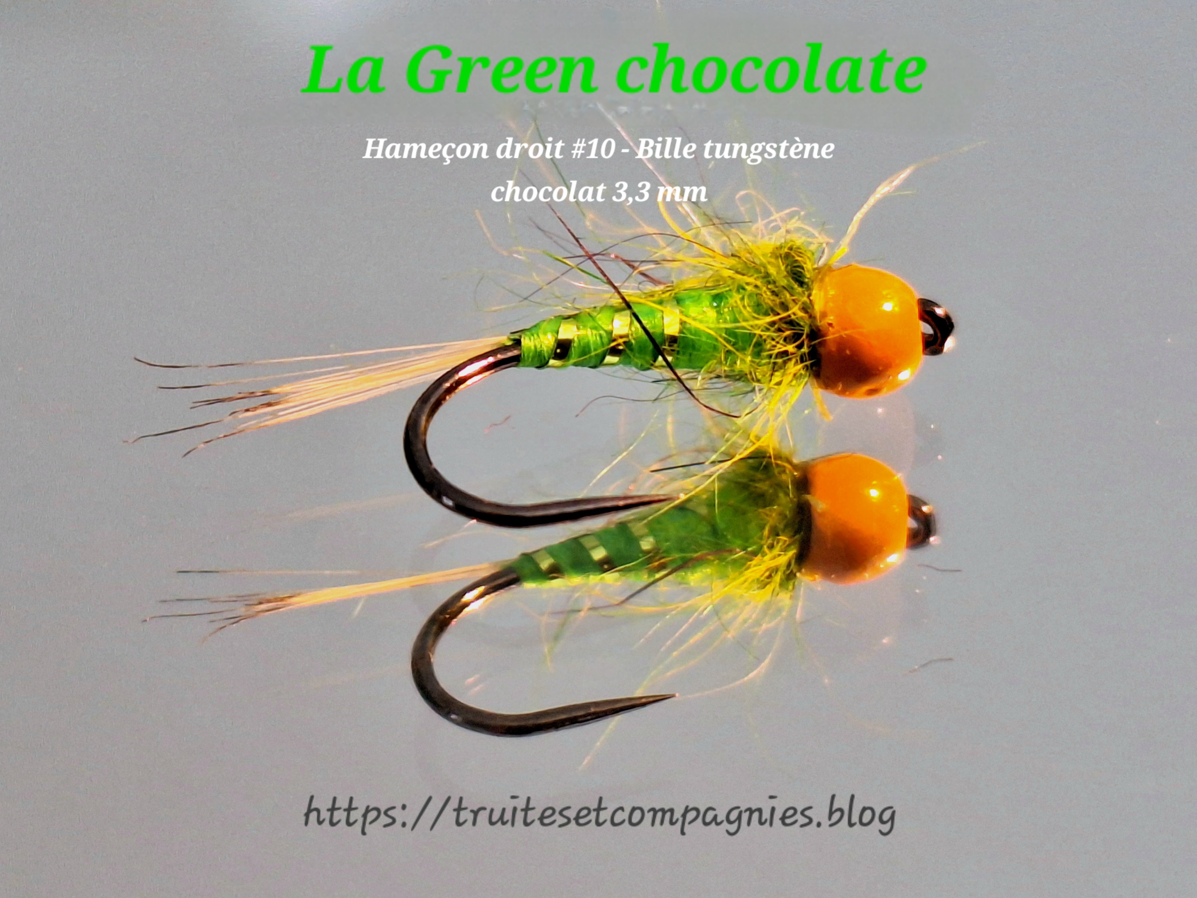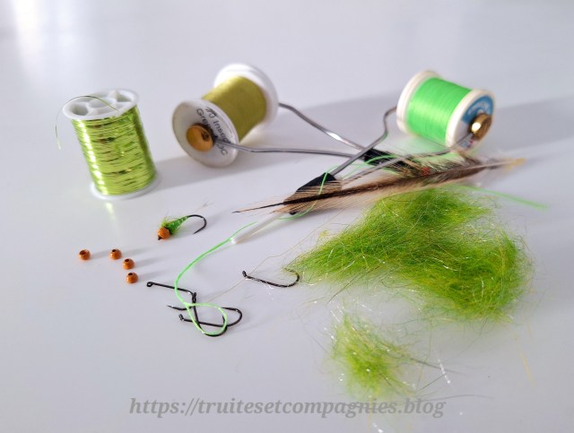Salut Nico, tu trouveras bien une petite place dans tes boîtes, 2 ou 3 suffisent pour une session. Pour le Green chaud, j’aimais bien prendre un Green chaud ou un vin chaud, pendant la pause, à l’époque où je faisais du ski de fond. Pour l’idée de l’association des couleurs, c’était évident du coup, j’avais des billes chocolat et de la floss verte et j’ai retrouvé un tinsel de la même couleur et de la à faire cette cette nymphe ,il n’y avait plus qu’à passer à l’assemblage. On fera des tests en cours de saison. La bise