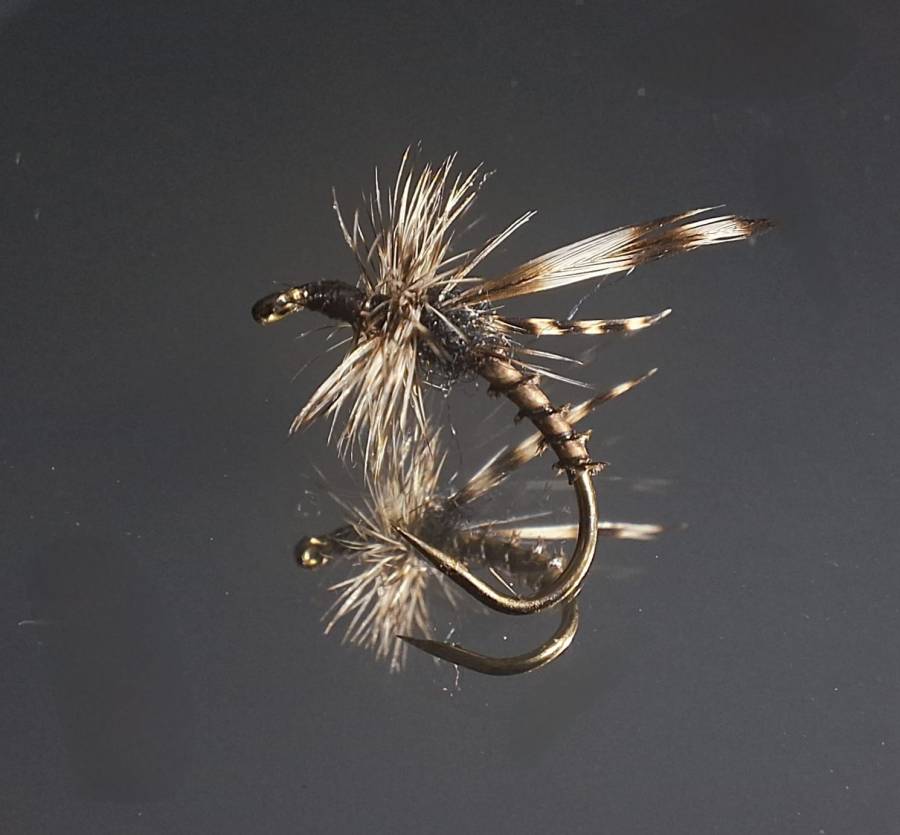 4) Parer deux pointes de hackles de coq, que vous allez fixer , les pointes dirigées vers l’arrière, ensuite préparer un très léger dubbing , que vous allez enrouler autour des ailes, un peu devant et un peu derrière, sans toutefois surcharger.