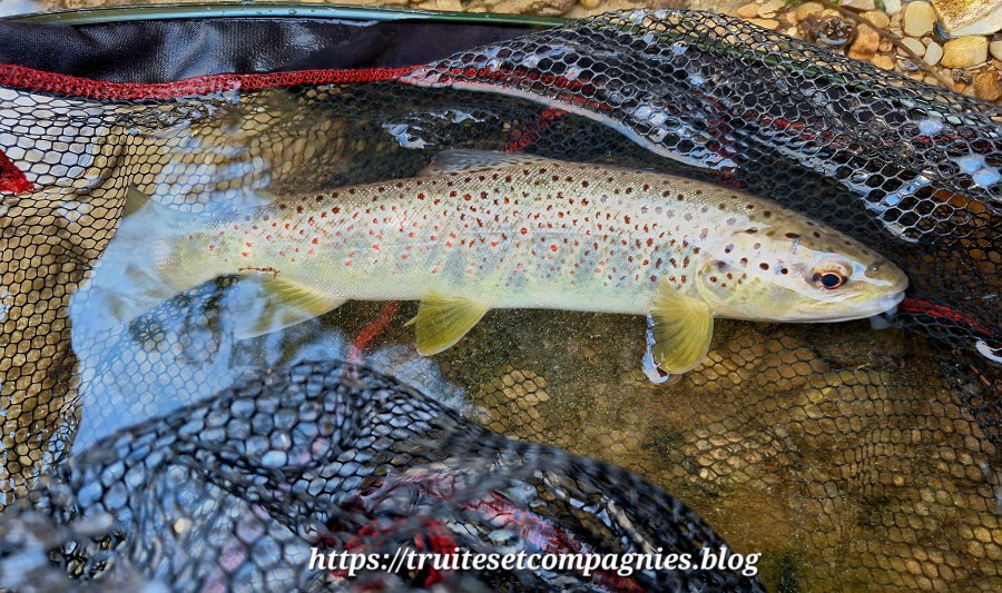 Après 3 heures de pêche, je vais terminer cette session avec 5 truites de prises à la nymphe, je ne vais publier qu,une seule photo, ce sera la plus grosse prise de ma session, les autres truites étant beaucoup plus petites, je n’ai pas daigné les photographier, mais elles sont tout aussi précieuses à mes yeux, car comme ont dit  » Petites truites, deviendront grandes « , en espérant qu’elles passent au travers des pièges de la vie.