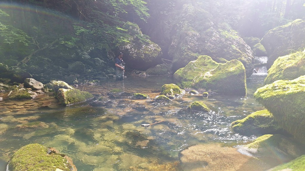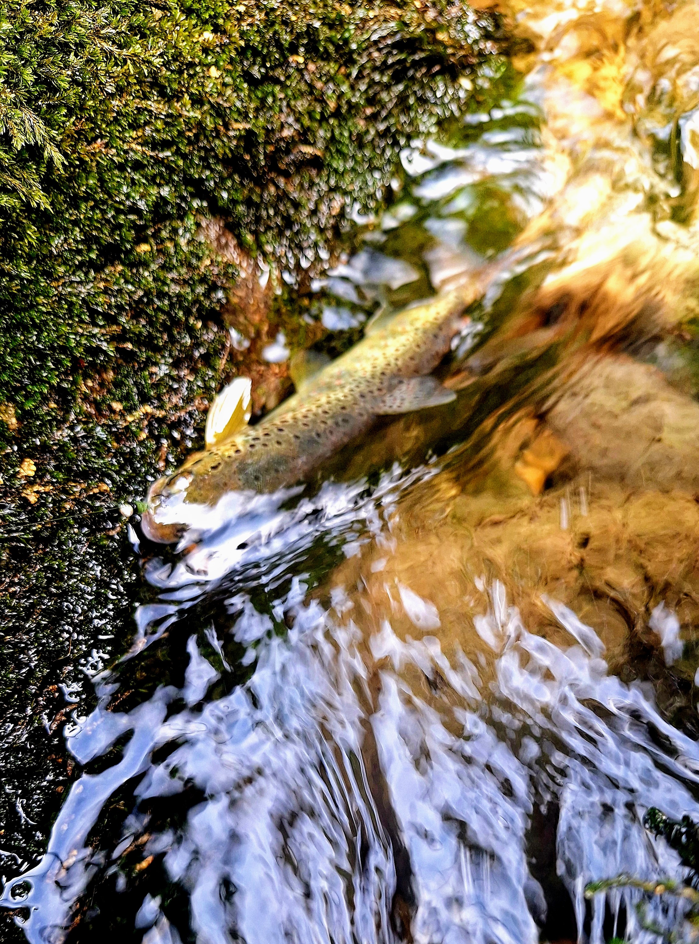 Bonjour à tous, il m’est difficile d,être disponible à chaque invitation de sortie de pêche, tellement j’ai des propositions,que je décline souvent par manque de disponibilités , car je consacre beaucoup de temps à ma famille. Mais ce 15 août, j’ai accepté de faire une sortie avec mon ami Damien Spoto (Damfly), qui lui aussi à peu de temps à consacrer à la pêche et donc comme il était disponible ce jour de fête, j’ai dérogé à mes habitudes et je suis allé le rejoindre en Chartreuse. Avant de rejoindre notre secteur de pêche, nous sommes allés saluer Jean, qui reprenait la route pour les Pyrénées et je me devais d’aller lui dire aurevoir. Après avoir quitté notre ami, nous avons pris la direction de la riviere, c’est donc sur les hauteurs que nous avons fait notre session, sachant toutefois que la partie serait pas simple car les niveaux d’eau etaient très bas. Et nous aurons du mal à faire bouger les truites, restées bien calées sous les blocs, malgré notre insistance à faire passer nos nymphes et nos sèches à ras des blocs , ceci sur un parcours de 250 m réalisé en deux heures, comme quoi nous avons bien prospecter tous les coups habituellement productifs et pour finir nous n,avons fait que trois truites en nymphe, fait bouger trois autres en sèche, ce fut un maigre lot de consolation, mais les dés étaient déjà jetés en étant sur place. De retour à la voiture, nous avons bu une petite bière bien fraîche et Damien qui devait rentrer pour le repas familial s’en est allé. J’ai voulu poursuivre seul sur un autre linéaire plus ensoleillé d’environ 250 mètres et j’ai pêché en sèche, je ne ferais monter que des petites truites en pêchant le long des saules bordant la rivière, avec comme mouche, une petite oreille de lièvre en 18, beaucoup de ratées au ferrage ,la seule maillée du lot c’est depiquée en arrivant à l’épuisette. Ceci à mis fin à cette session de la Ste Marie ,à 15h00, j’étais en train de plonger dans ma piscine, tellement j’ai eu chaud au cours de cette partie de pêche.