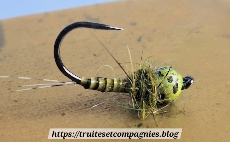 Hameçon : 12 a 14 – Cerques : pardo – Abdomen : Quill de paon ébarbé teinte jaune/olive – Thorax : dubbing de lièvre olive- Tête : bille tungstène 2,8 mm olive tachetée – Fil de montage : olive 12/0 .