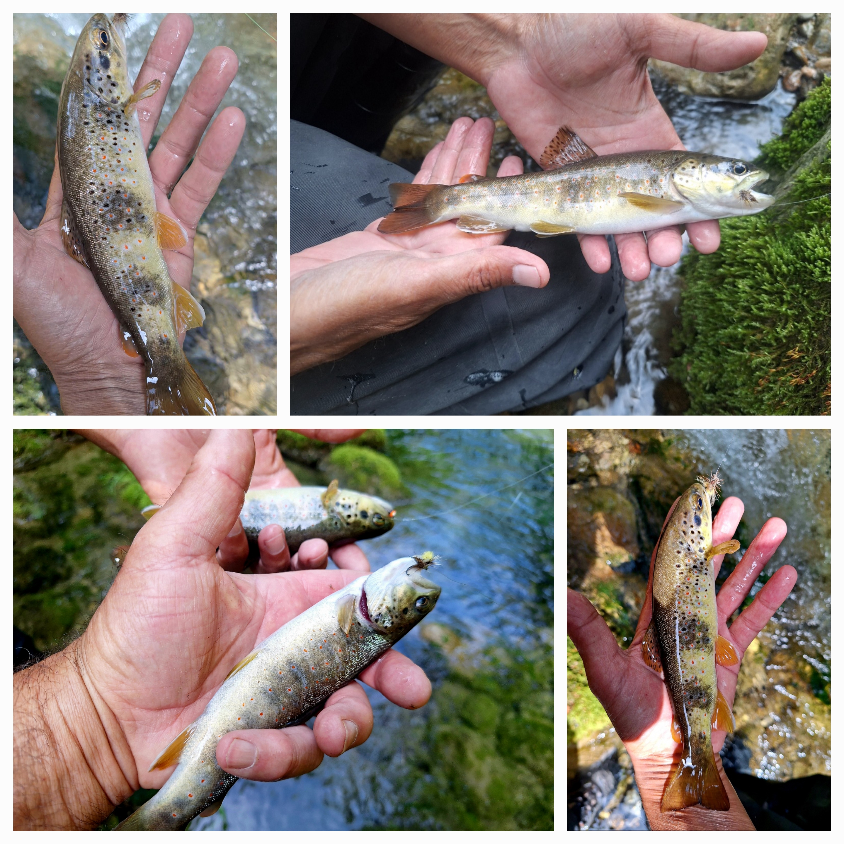 Bonjour à tous, pour cette sortie du vendredi 6 juin, il fallait crapahuter un peu pour trouver quelques autochtones, que nous avons dès les 1ers coups de ligne, chercher à la nymphe. Cette journée de partage s’est réalisée avec un copain de longue date, David Blazquez, que j’ai connu gamin. Le soleil n’était pas encore à son apogée, mais sous la végétation et les grands arbres, nous avons pu gratter quelques truites en pêchant à la nymphe. Ce n’est qu’à mesure de notre avancée que le soleil commençait à réchauffer les zones dégagées. . Les eccdyonurus venosus (rouge), et d’autres éphémères plus petits (baetis) commencaient à virevolter au dessus de l’eau. Alors sans l’ombre d’une hésitation, je suis passé en sèche, et nous avons pu prendre quelques jolies sauvageonnes, venues goûter à nos sedge chevreuil et Tavanas. Ce fut un bon moment de rigolade, car David n’avait pas repêché à la mouche depuis une 30 aine d’année, au fur et à mesure de notre progression, les truites devenaient de plus en plus activent et le pote prenait de plus en plus de plaisir avec cette pêche ludique. Tellement pris par la passion, nous en avons oublié le casse croûte et pire encore, de prendre une bouteille d’eau. Vers 17h00, nous avons mis fin à cette session, qui aurait pu encore durer, mais les courbatures, qui sont le prix à payer pour cette expédition montagnarde, ont mis un terme à cette partie de pêche 😄 Je ne donnerais pas le nombre de prises, que nous avons fait, ce serait indécent de ma part, mais il y en a eu beaucoup.