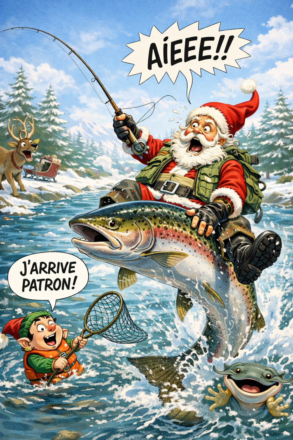 A la pĂȘche Ă la mouche, quand le pĂšre NoĂ«l teste la pĂȘche Ă la mouche, certains poissons prennent le contrĂŽle, ferrage rĂ©ussi …. et chaos garanti ! La truite devient alors monture officielle et mĂȘme le pĂšre NoĂ«l Ă ses jours Plouf ! plouf ! đđđ