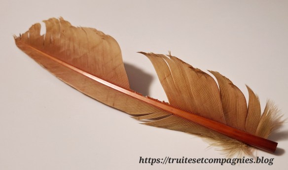 Je souhaitais une teinte caramel, mon ami Aurélien » Aux plumes d’Or Elle « , toujours à l’écoute des demandes et prêt à réaliser des teintes de plumes, qui a conçue cette teinte, c’est du travail à façon en quelque sorte.