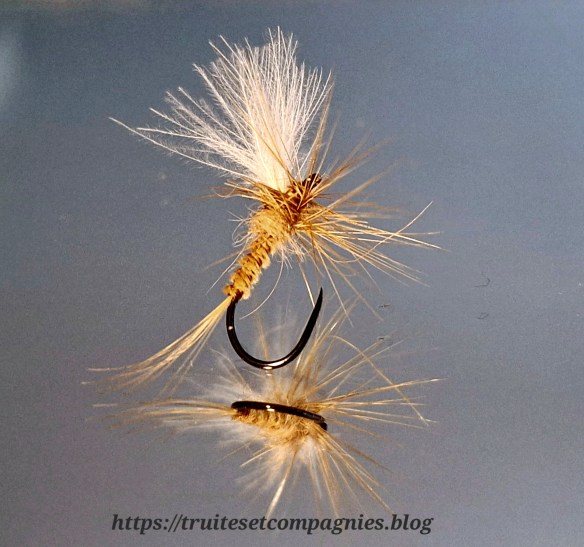 Hameçon : droit #16 – Cerques : hackles gris- Abdomen : herl d’oie teinte caramel (Aux plumes d’or Elle) – Thorax : dubbing lièvre- Toupet : cdc blanc- Collerette : hackle de coq Metz – Fil de montage : Semperfli 12/0 Brown .