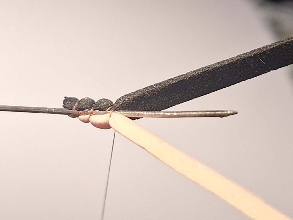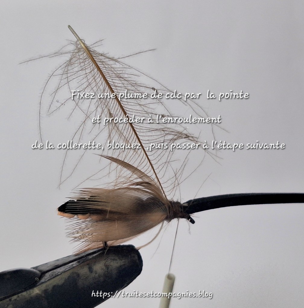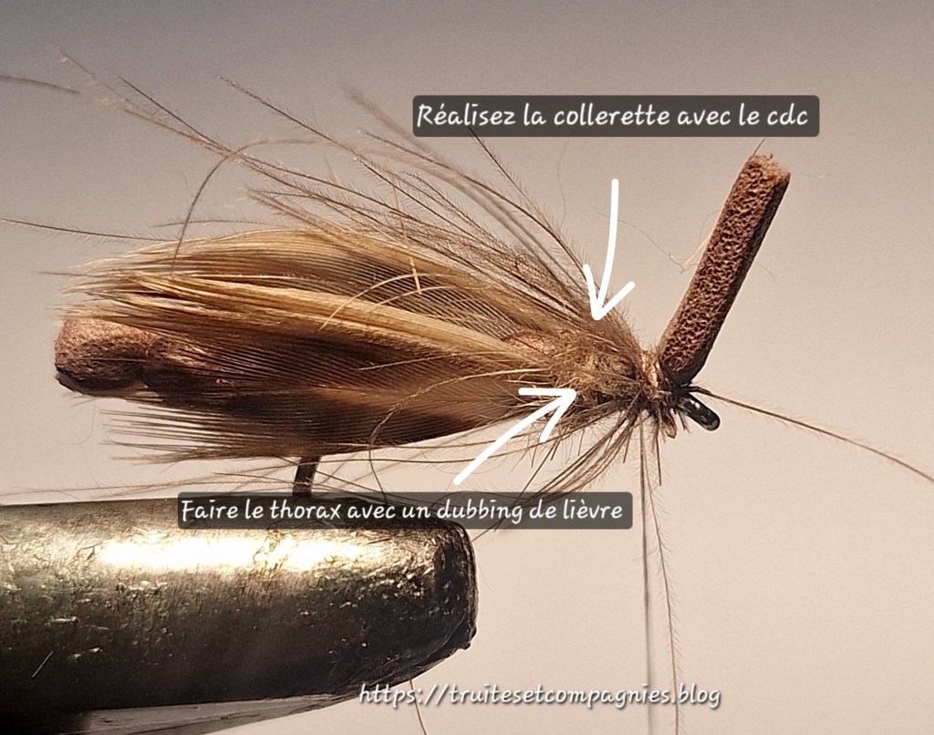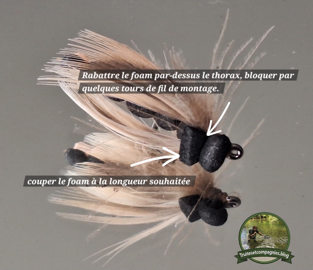 Hameçon: droit n°10/12 – Corps : foam deux couleurs largeur 5mm, (beige et noire ou marron) –Ailes: plumes de flanc de colvert + plume de Cdc –Thorax:dubbing de lièvre –Sac alaire foam –Tête: fil de montage 12/0 ou 8/0 marron.