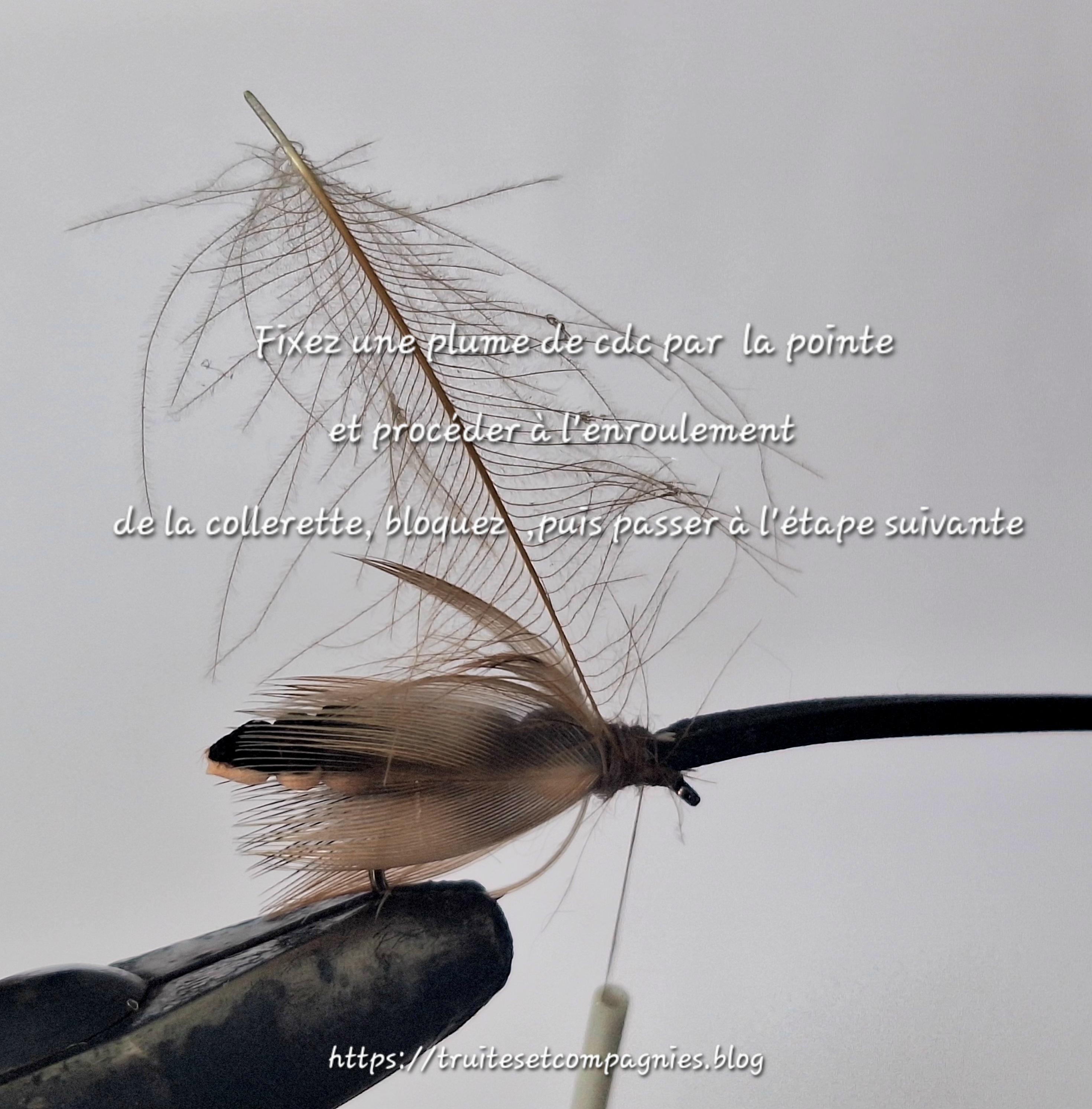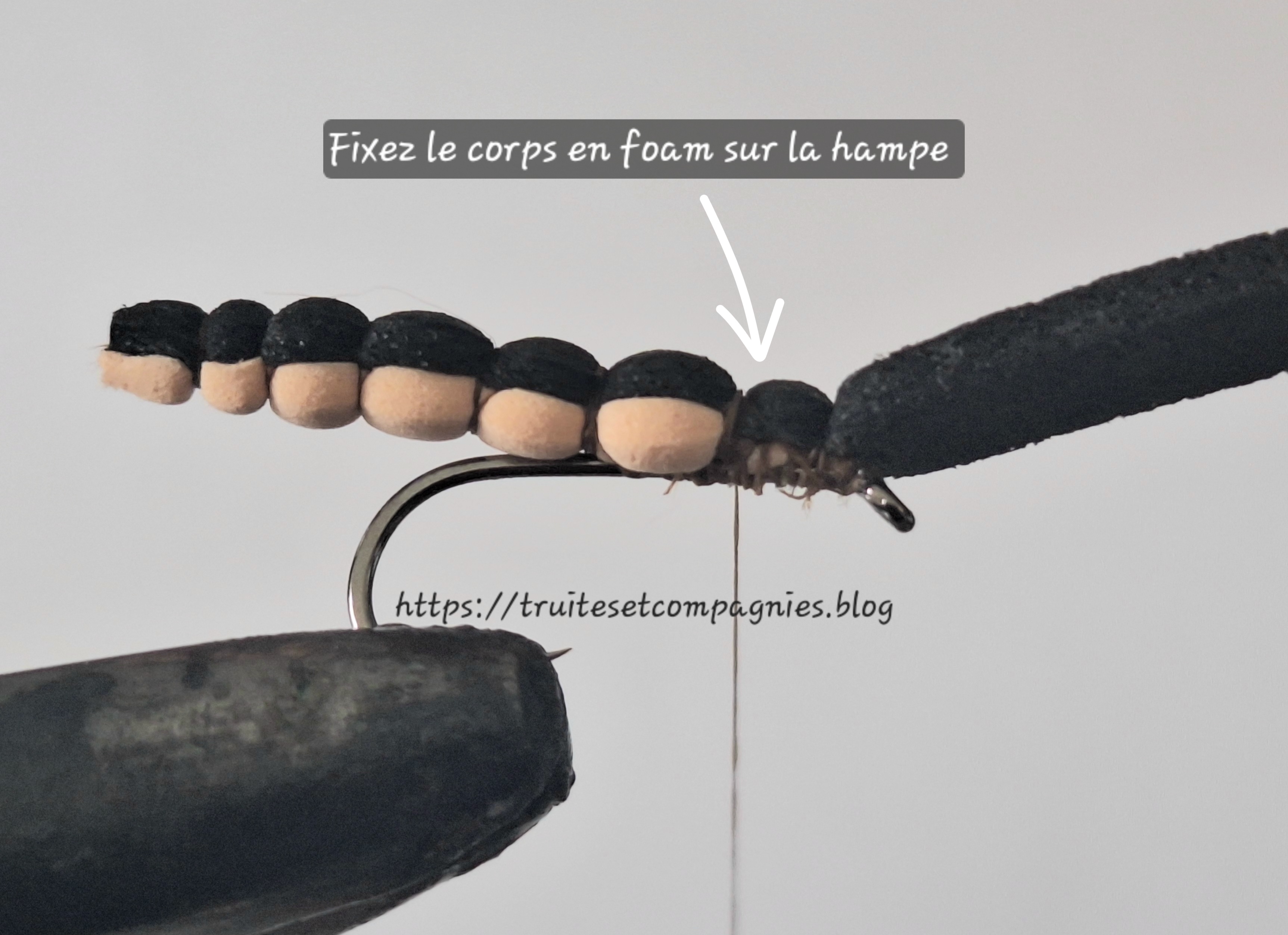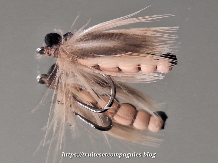 Hameçon: droit n°10/12 – Corps : foam deux couleurs largeur 5mm, (beige et noire ou marron) –Ailes: plumes de flanc de colvert + plume de Cdc –Thorax:dubbing de lièvre –Sac alaire foam –Tête: fil de montage 12/0 ou 8/0 marron.