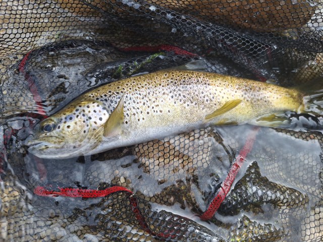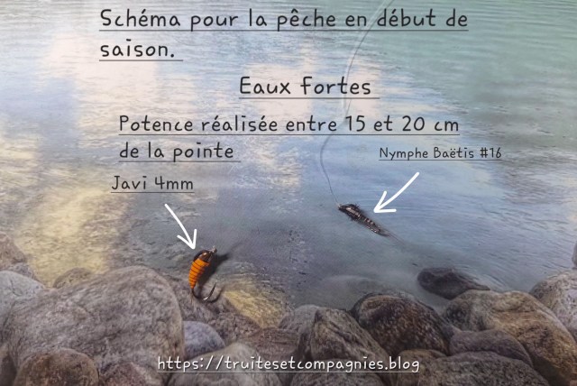J’ai donc tout simplement remplacé ma nymphe de pointe par une Javi tungstène de 4mm et j’ai laissé sur la potence, la nymphe de baetis (pheasant tail) #16, le résultat a été de suite probant. En pêchant avec cette nymphe de pointe plus lourde, ma dérive était plus lente et la touche fut sans appel.