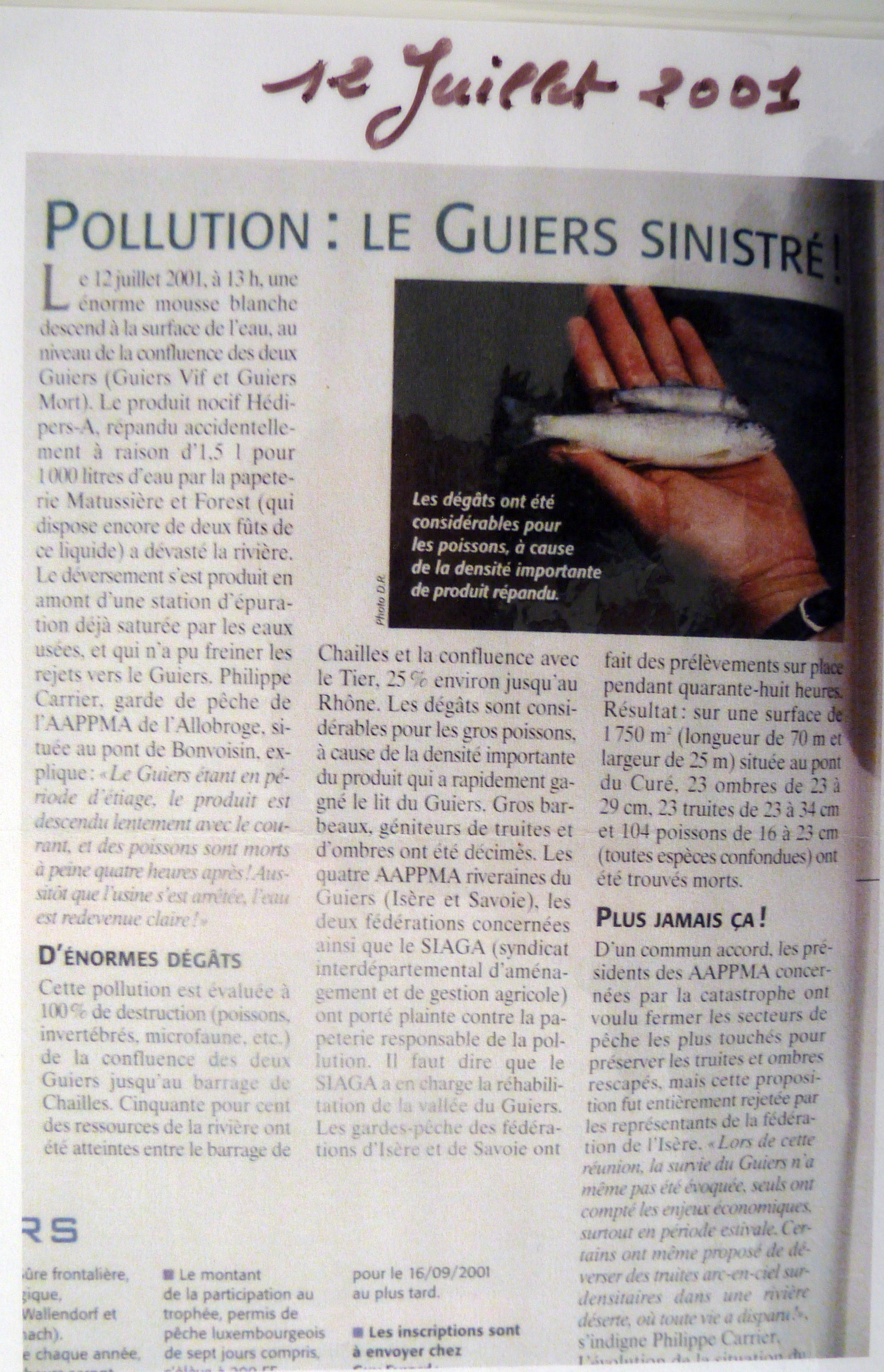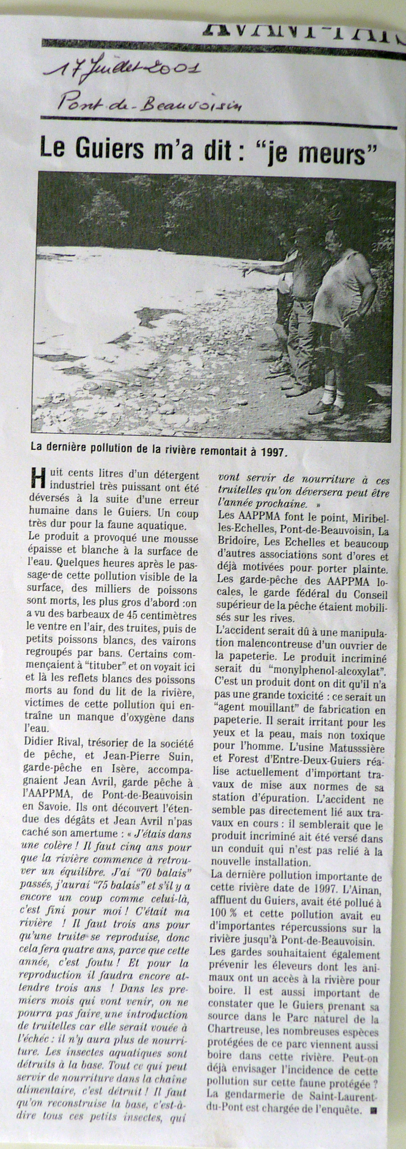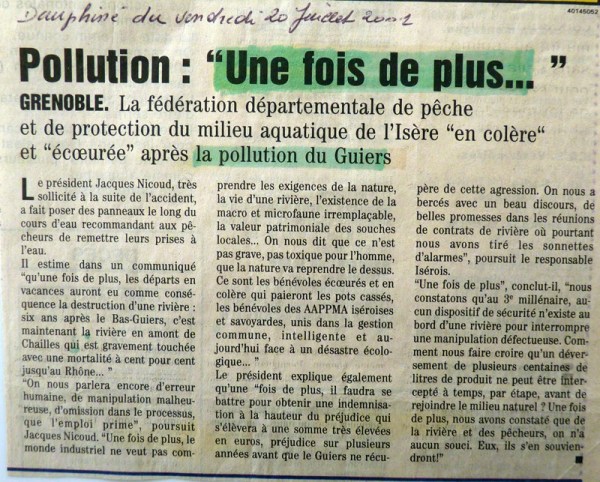 En 2001, le Guiers a subit une nouvelle fois, une terrible pollution, le 12 juillet 2001, à 13 heures une énorme mousse blanche descend à la surface de l’eau, au niveau de la confluence des deux Guiers, le vif et le mort. Le produit nocif Hédipers-A répandu accidentellement à raison d’1,5l pour 1000 litres d’eau par la papeterie Matussière et Forest a dévasté la rivière. Cette pollution à été évaluée à 100% de destruction (poissons, microfaune, invertébrés etc) de la confluence des deux GUIERS jusqu’au barrage de Chailles.