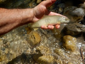Nous avons évité de pêcher les zones à ombres, mais sur cette rivière ce n’est pas si simple, car ils sont de partout. J’en prendrais un 40 + à la nymphe, dans une veine d’eau en bordure du courant, ce sera le seul du séjour pour ce qui me concerne et je m’en réjouis, je pourrais m’occuper d’eux d’ici quelques jours, puisque l’ouverture de l’ombre sera officiellement effective.
