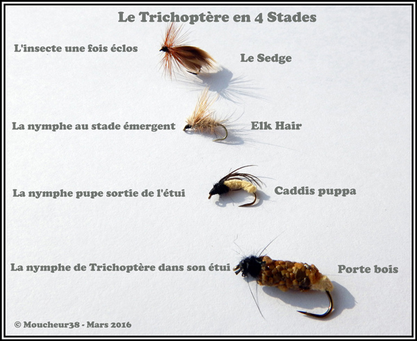 Comme vous pouvez pu sans doute remarquer, je suis toujours dans ma période Tricho, normal nous sommes en hiver, mais je ne parle pas de pull, juste une petite mise en situation en réalisant ce tableau , afin de vous permettre de visualiser les différents stades de transformation du Trichoptère. Non pas avec de vrais insectes, mais avec les différents modéles de mouches et de nymphes et des appellations , que nous leur donnons et que vous devriez posséder dans vos boites.