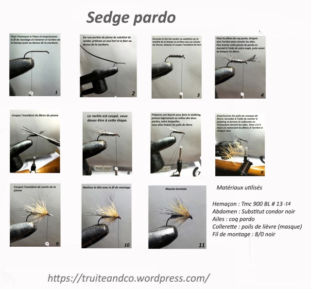 le sedge Pardo, fais partie des classiques, il est très simple à réaliser, mais le seul petit bémol c’est le coût de ces plumes de coq Pardo qui sont onéreuses, mais je ne peux m’en passer pour mes montages de nymphes ou d’artificielles.