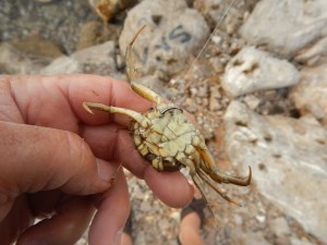 L’eschage du crabe, conseillé par un pêcheur Toulonnais,on supprime les pinces, les pattes des deux deux côtés, mais pas toutes et de passer son nylon à l’aide d’une aiguille en le traversant de part en part pas les pattes manquantes et de prendre soin de cacher l’hameçon sur l’arrière du crabe.